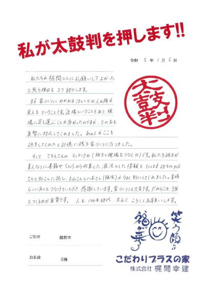 梶間幸建は福井に根ざし、地域のみなさまとともに歩んできた工務店です。私たちの家づくりは“良い家を建てること”だけがゴールではありません。ご家族の思いや暮らしのあり方と真正面から向き合い、“どれだけ幸せに住み続けていただけるか”を大事に考え、お客様にとって“本当に必要な家”をご提供することに日々努力しています。