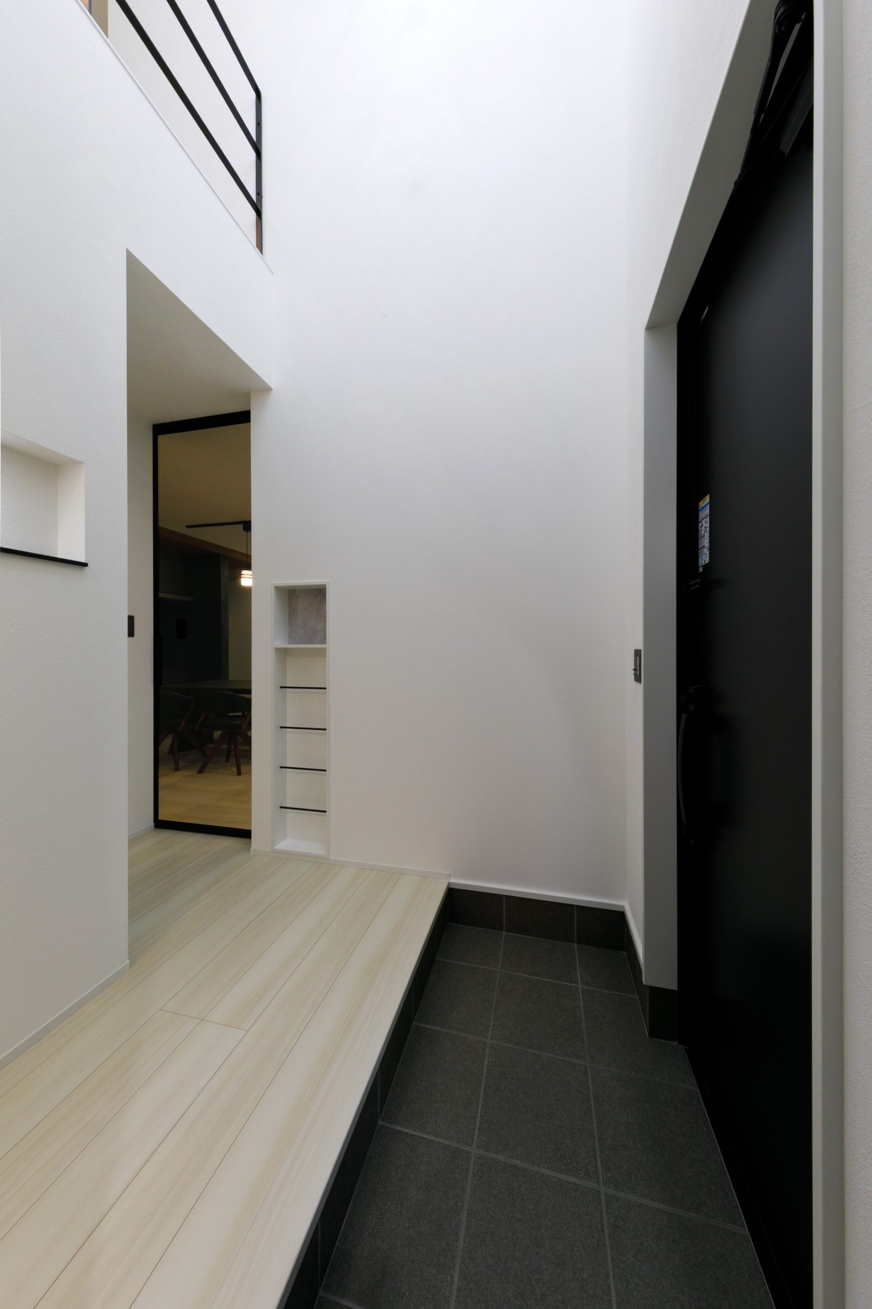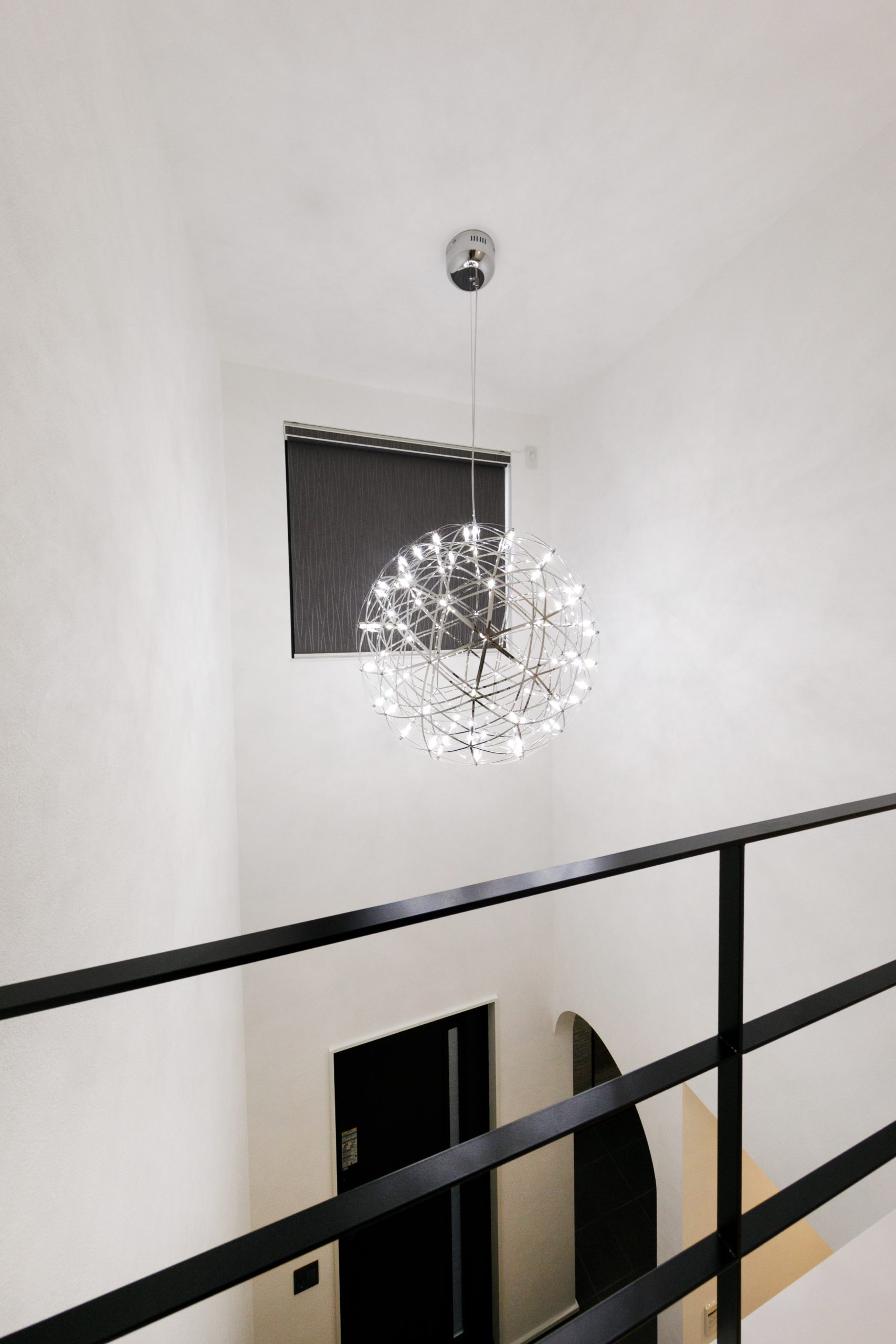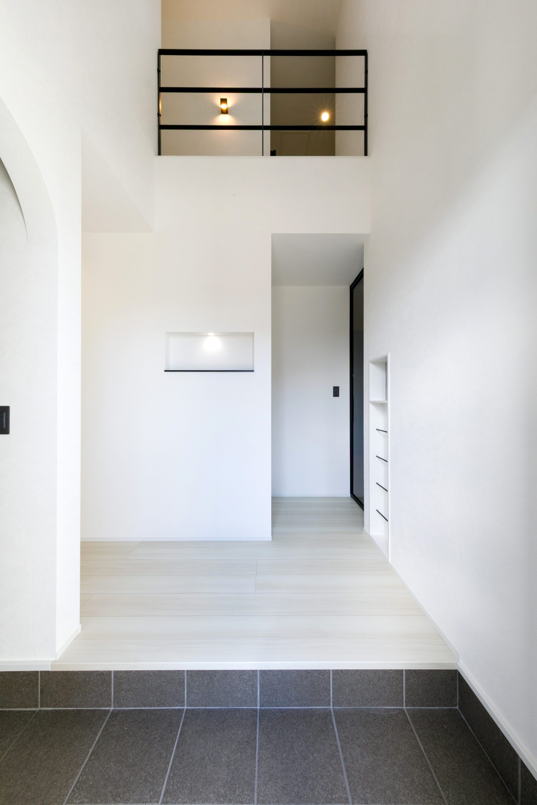 玄関を開けると吹抜けの開放感が広がり、アイアン手すりが洗練されたアクセントを添えます。