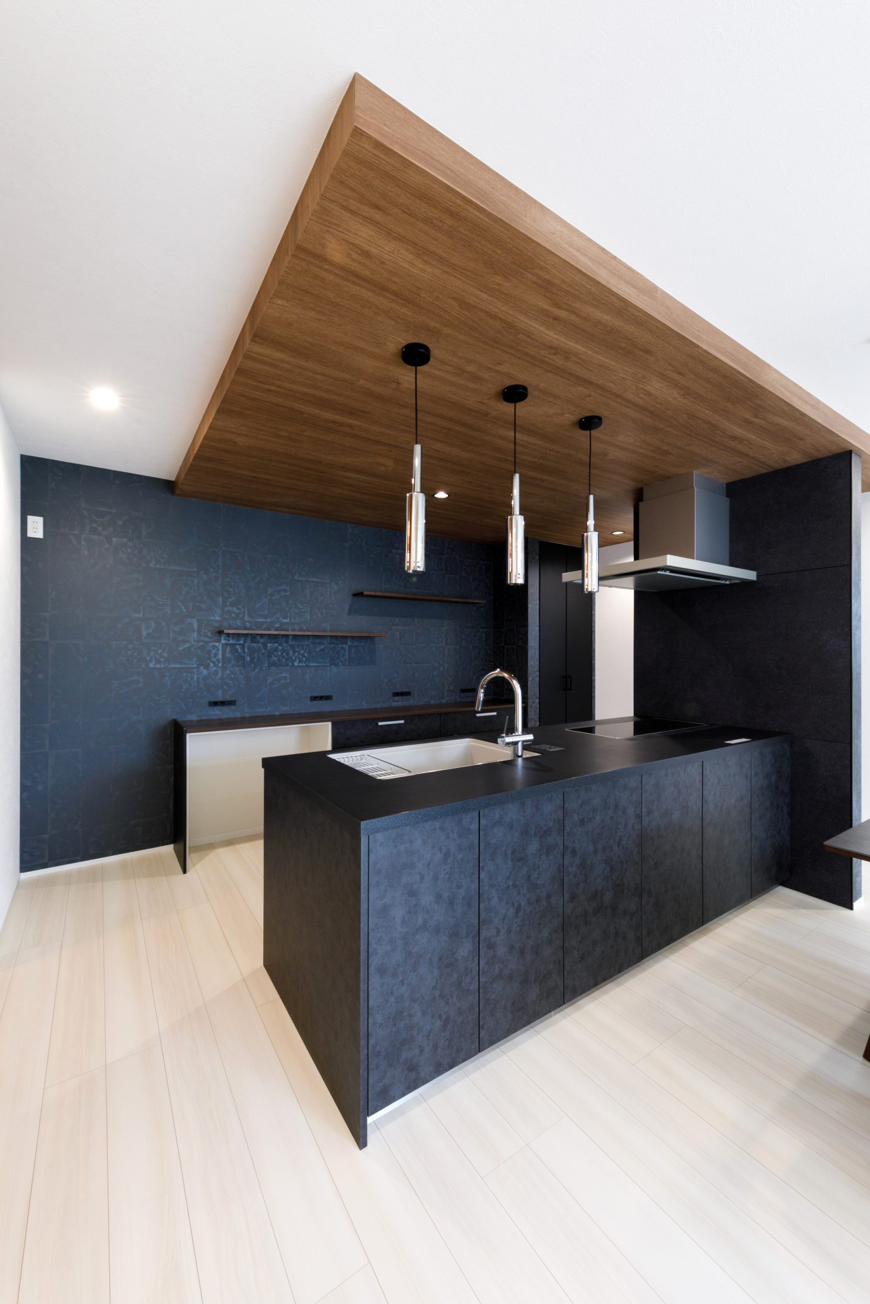 キッチン背面もブラックで統一し、高級感溢れる空間に。 -