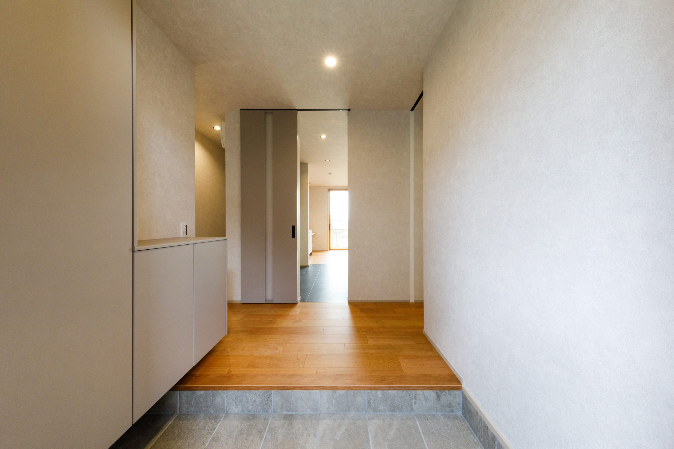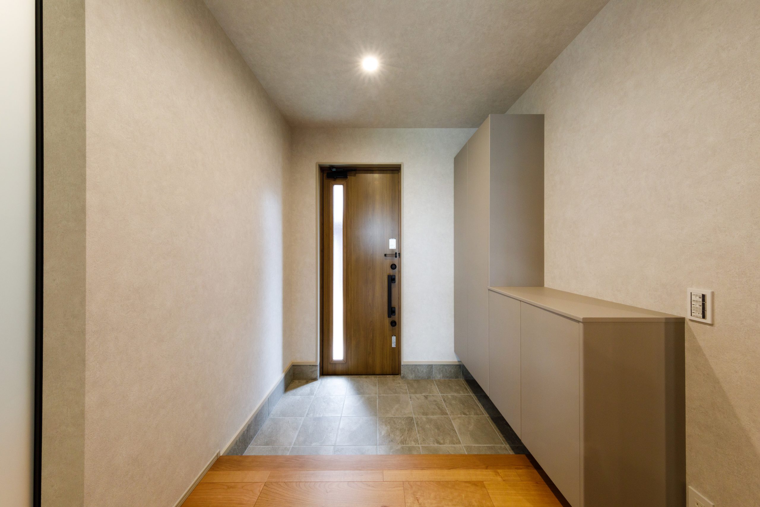 グレージュトーンで統一することで、上質で落ち着いた雰囲気を演出された玄関。