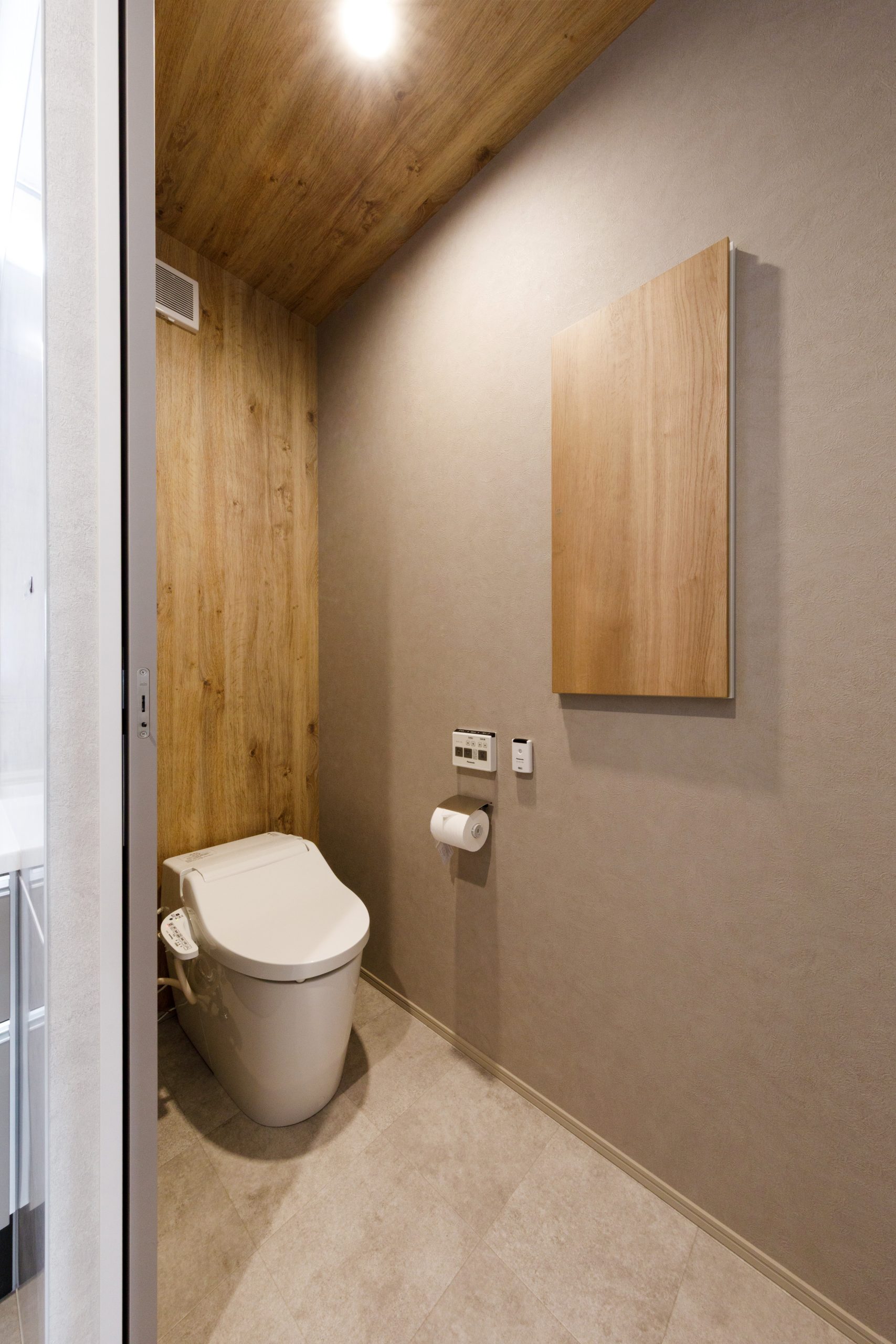 木目とグレージュトーンでまとめた、落ち着きのあるレストルーム。