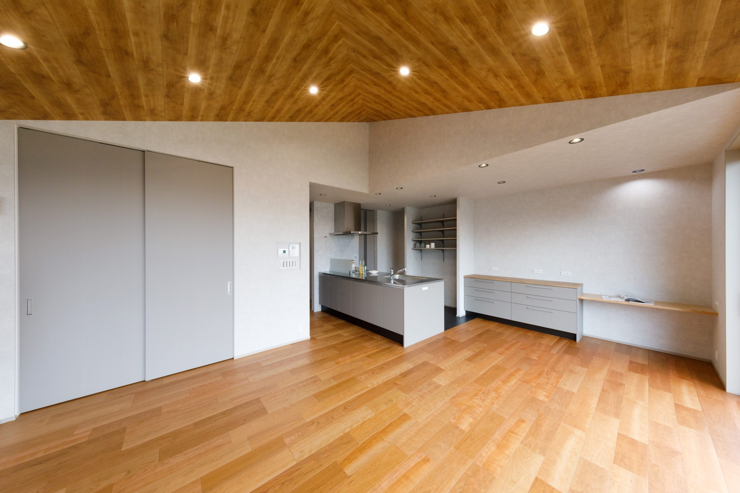 勾配天井が描くダイナミックなラインが印象的なLDK。