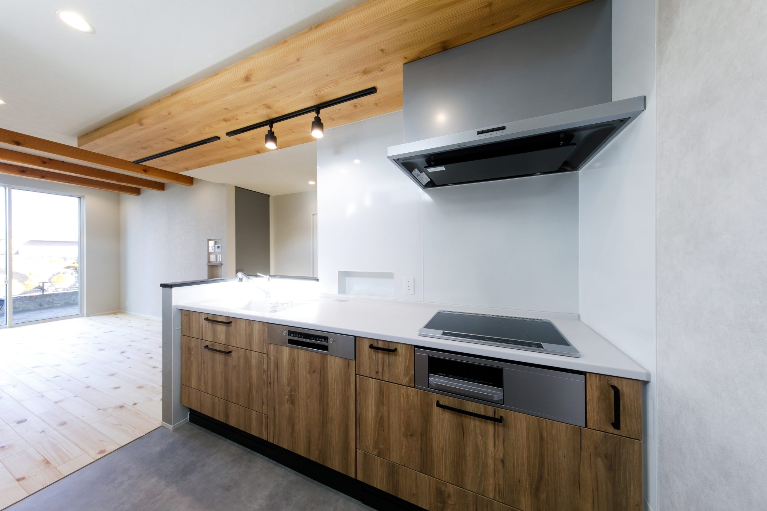 キッチンは折り下げ天井にマッチした木目をチョイスして