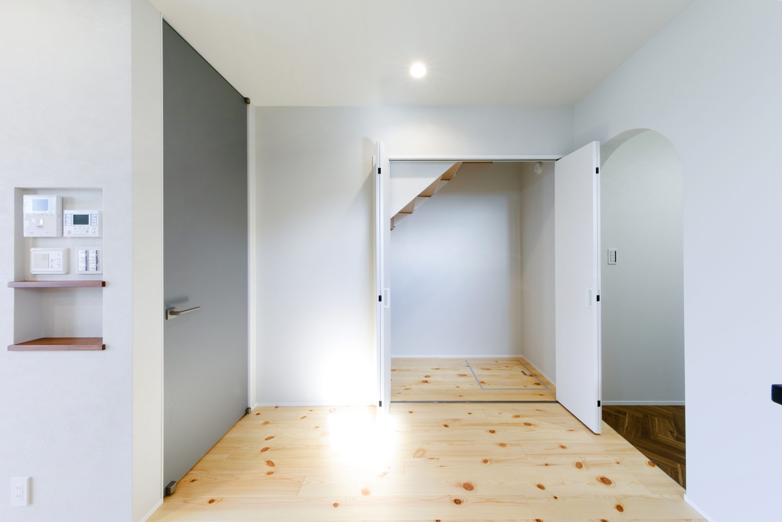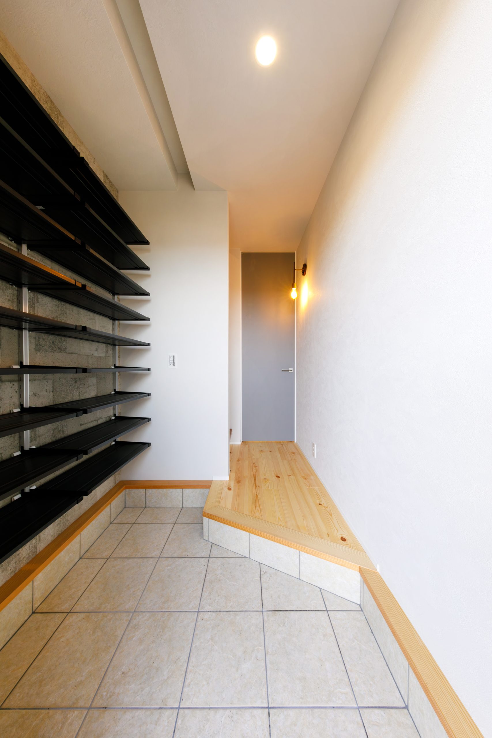 玄関の壁面を有効活用した、大容量のシューズクロークを備えた玄関空間。