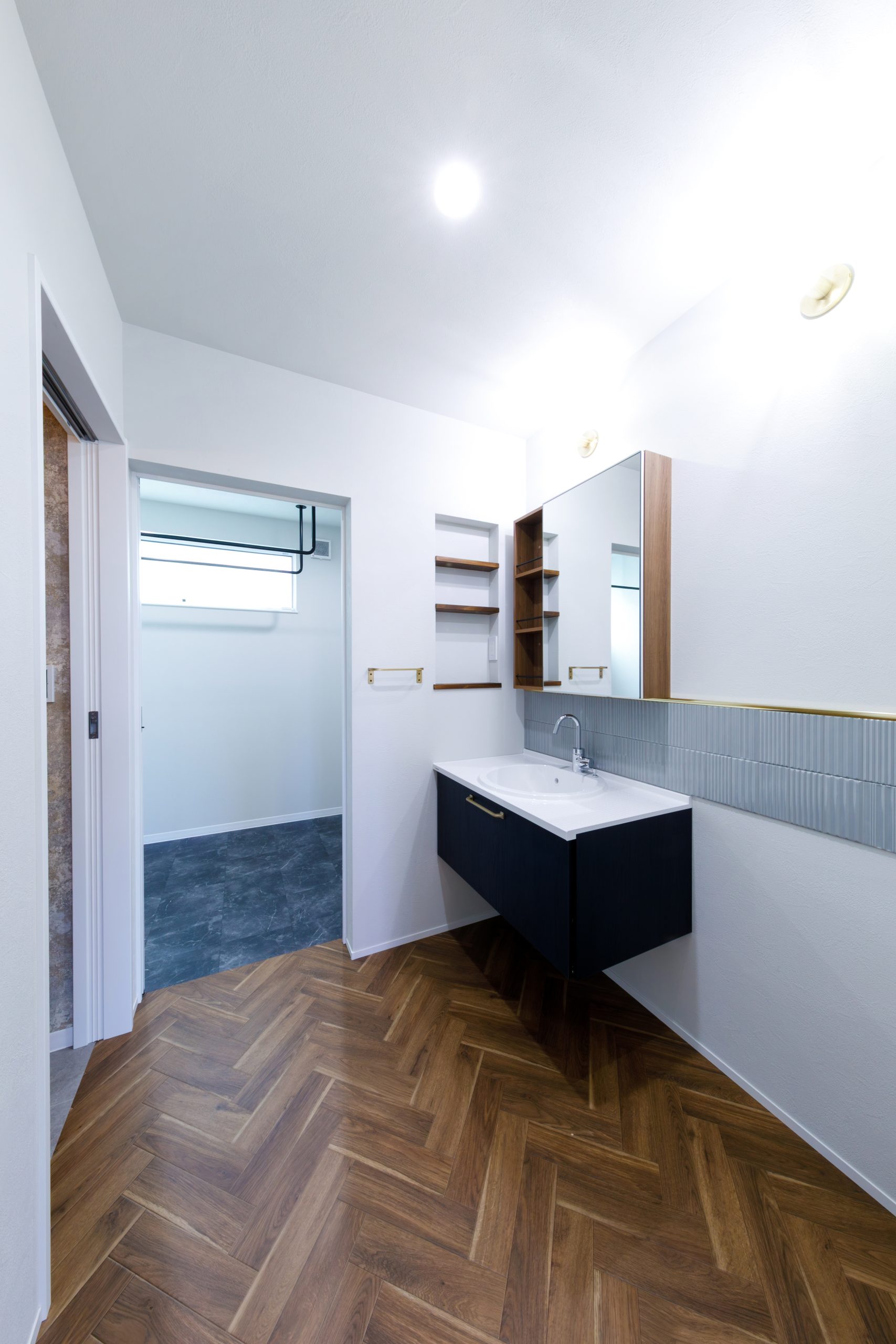 造作風洗面。ブラックのキャビネットと真鍮調のアクセントが空間を引き締め、