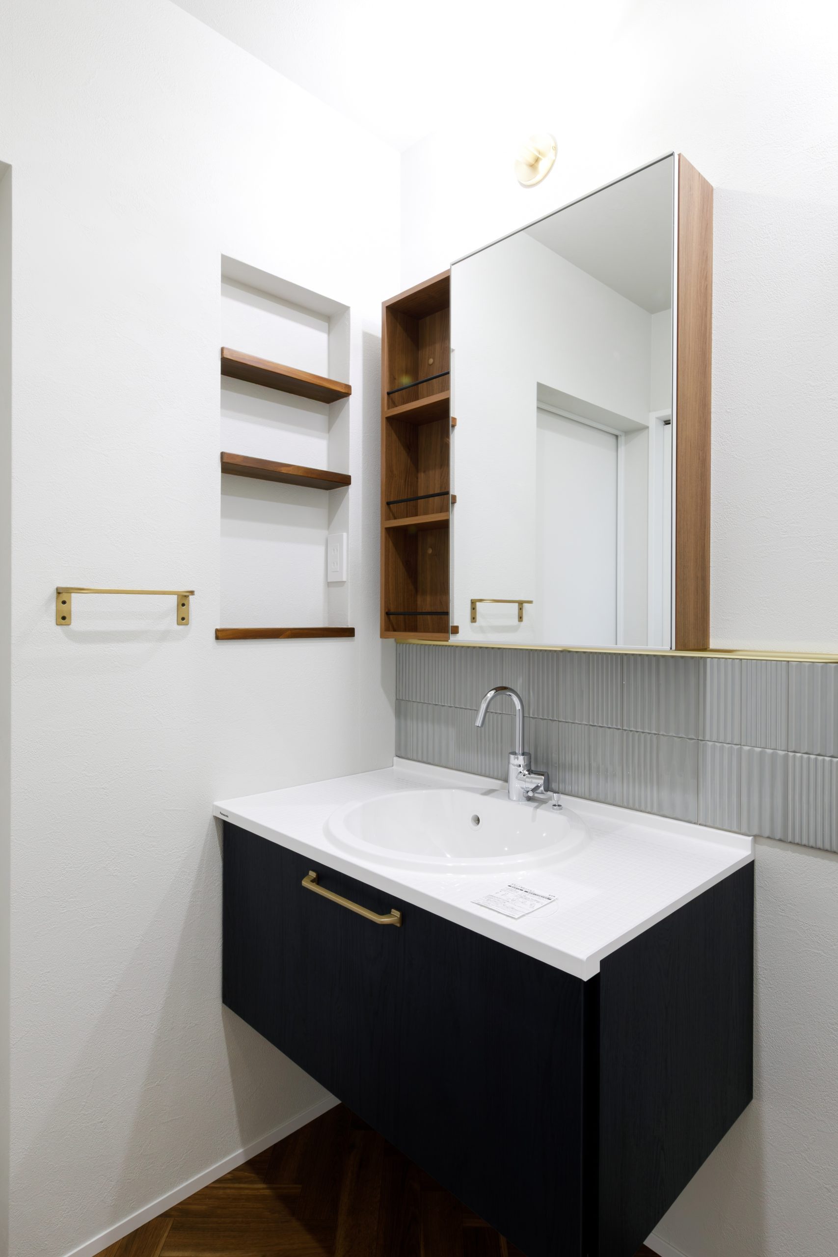 パナソニックの洗面化粧台をベースに、こだわりのタイルや鏡を組み合わせた