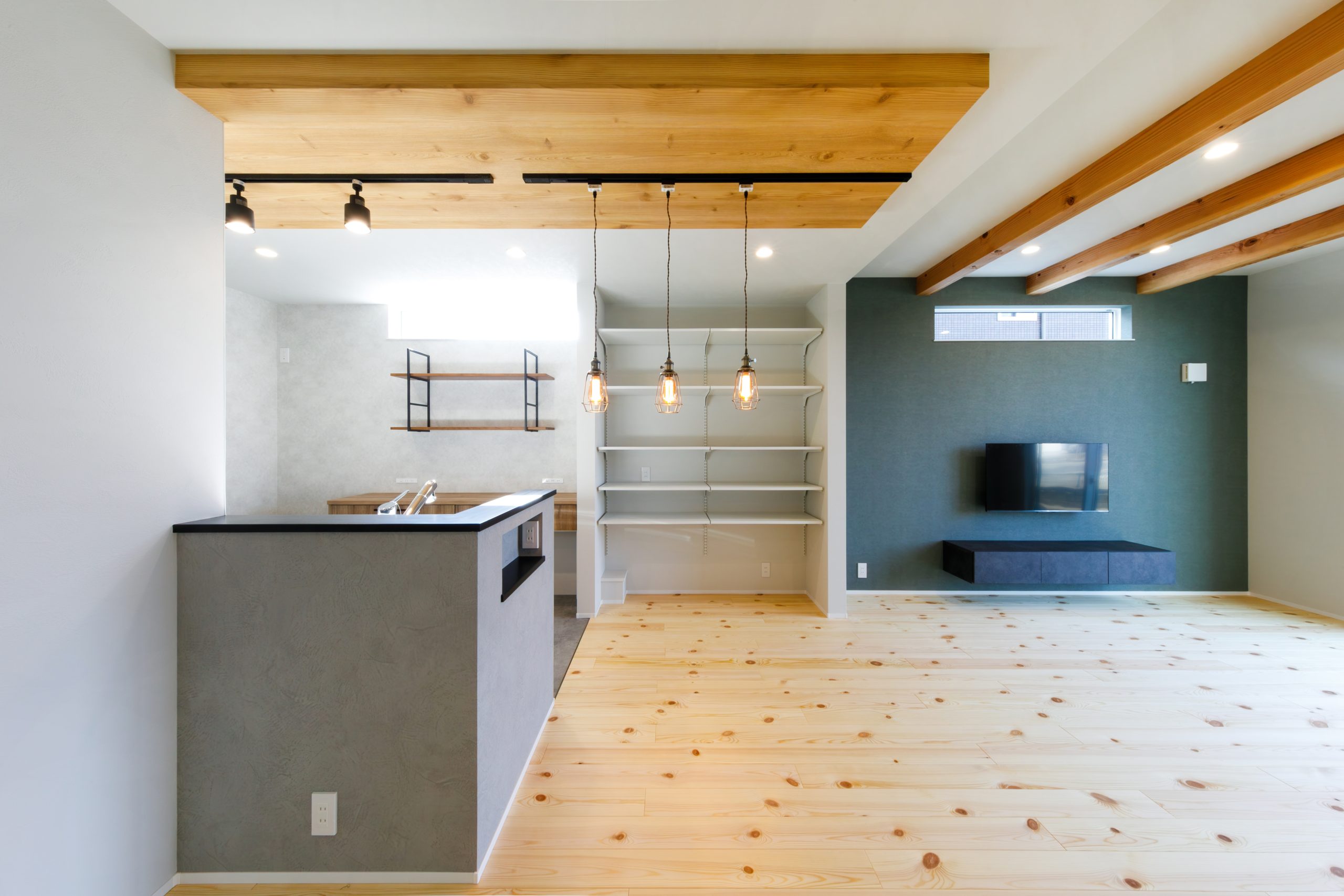 天井には木目をあしらい、梁やペンダント照明がリズム感のある立体的な