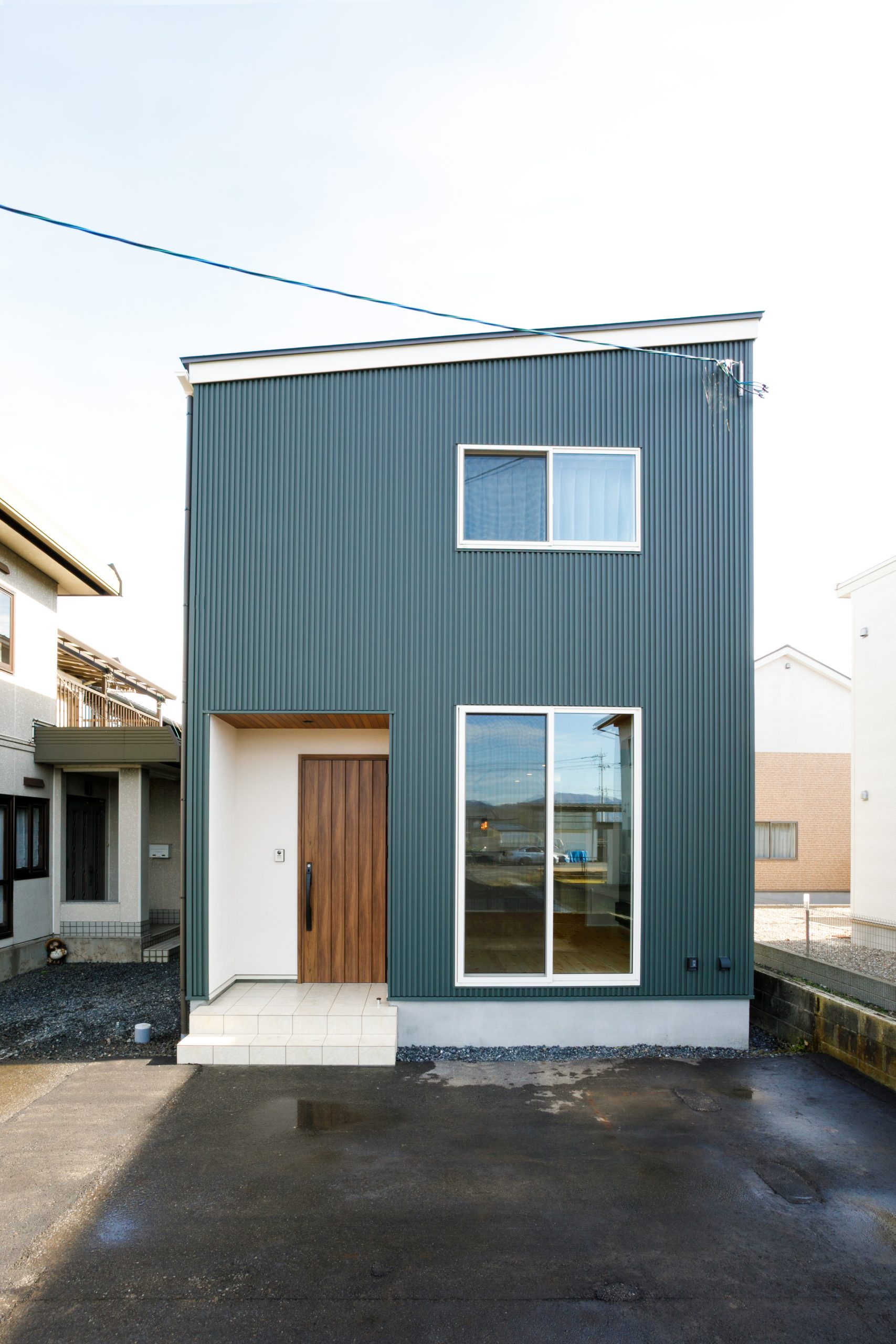 グリーンのガルバリウム鋼板を外壁全面に採用した、シンプルで洗練された