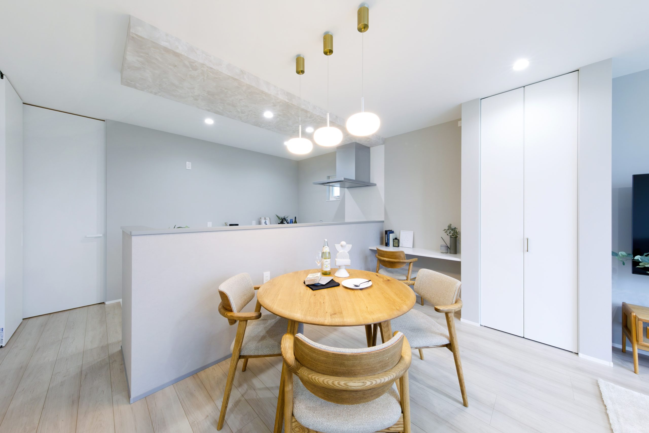 照明と天井デザインが調和した、シンプルながらも個性が光るダイニングです。 -