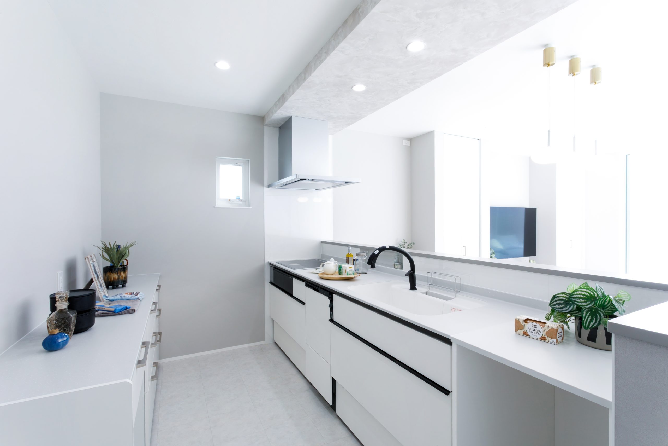白を基調にした明るく清潔感のあるキッチン。手をかざすだけで操作できる