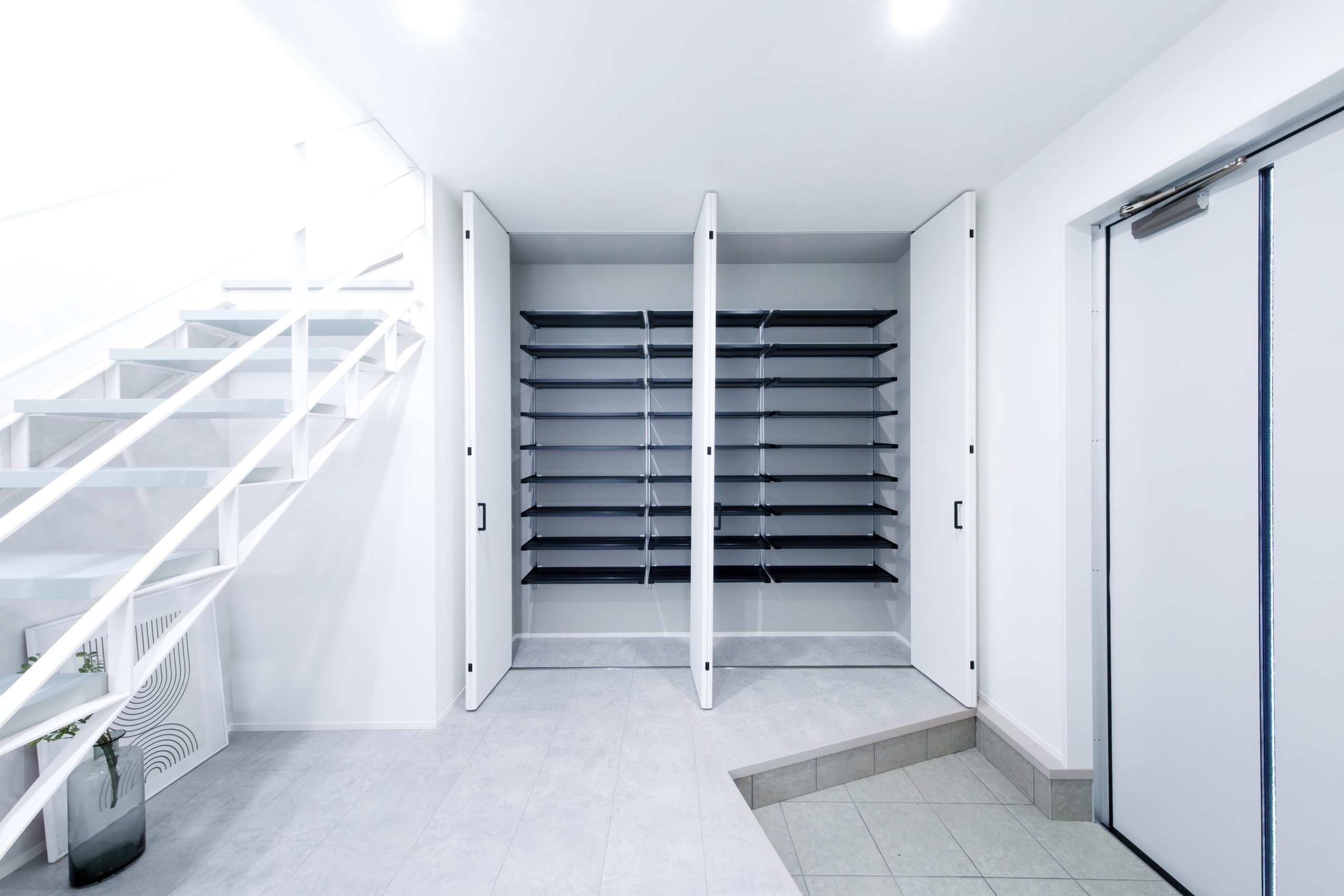 壁一面に設けた大容量のシューズクロークにはご家族の靴を