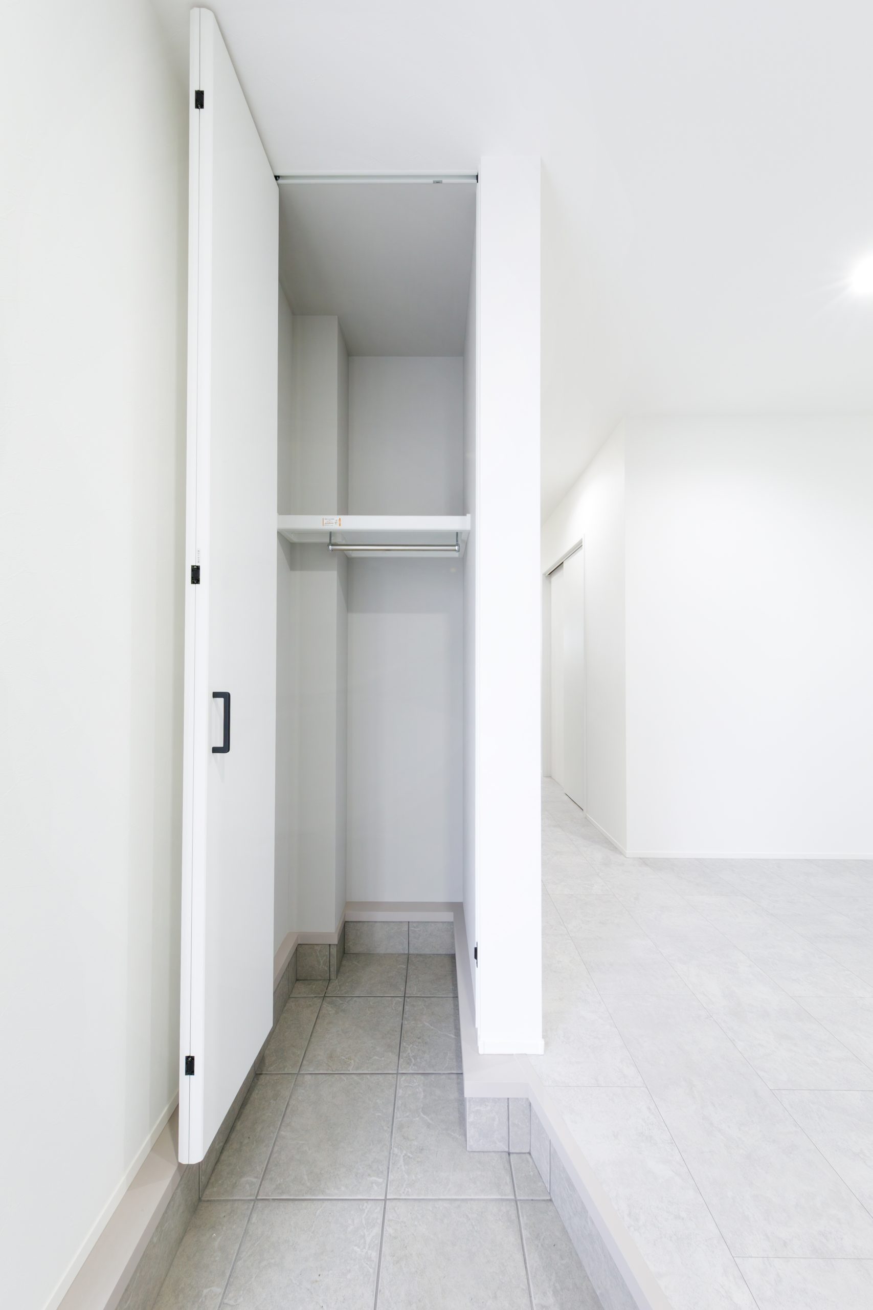 反対側には濡れた上着などを収納できるスペースを設けました。 -