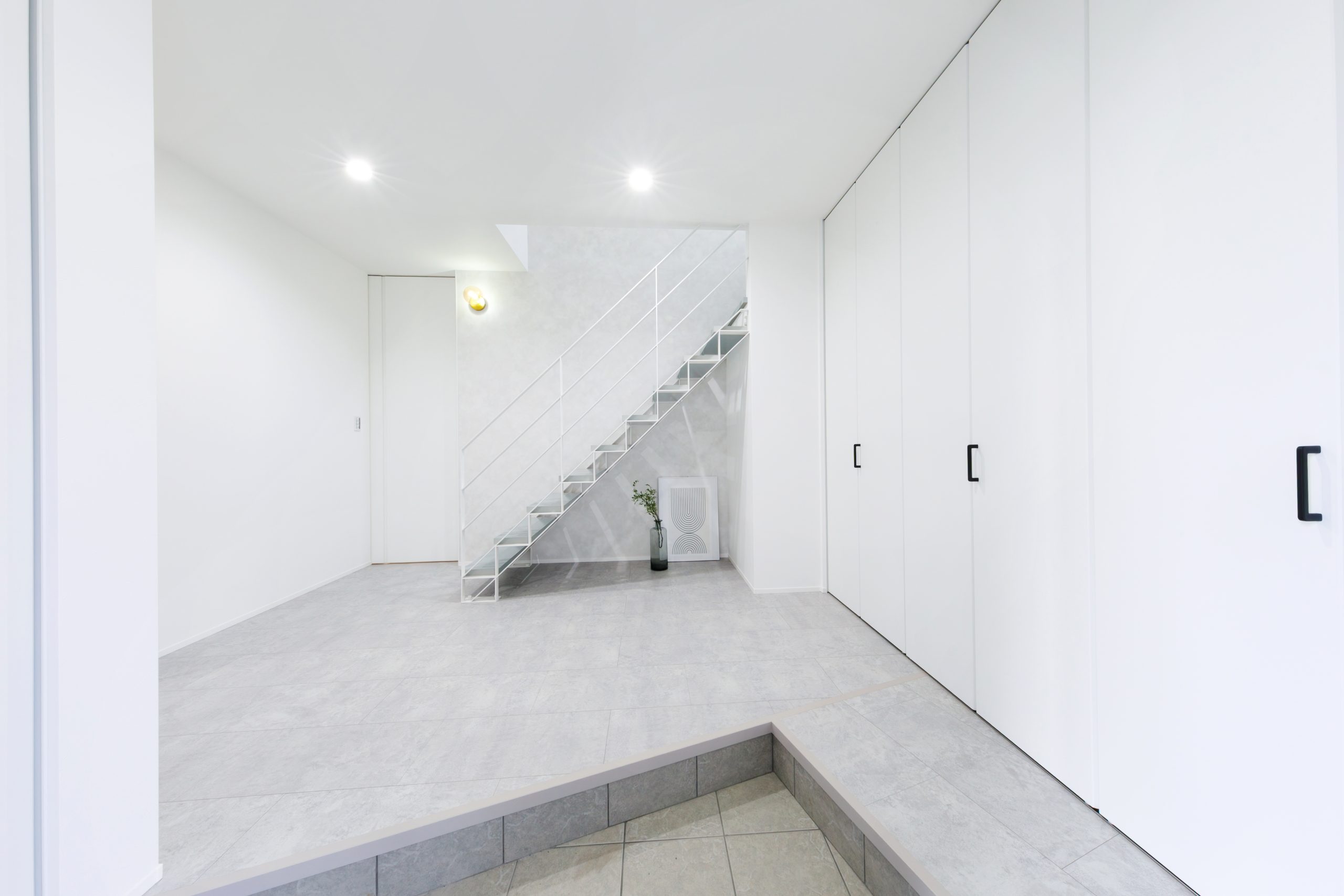 ホワイトとグレーでコーディネートした、明るく洗練された玄関ホール。