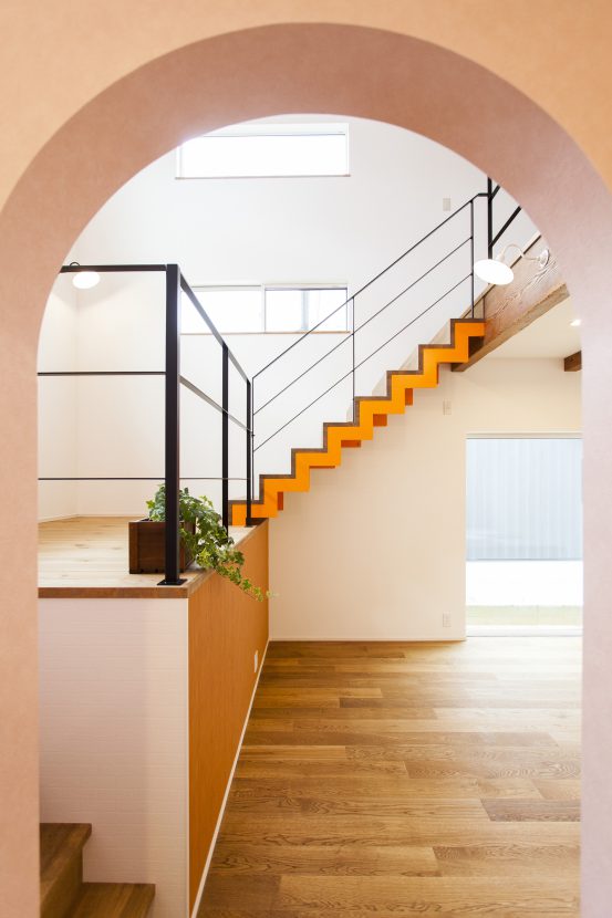 Mamanスタイルの外観にピンクの塗り壁!スキップフロアが生み出す 楽しくて 開放感たっぷりの空間